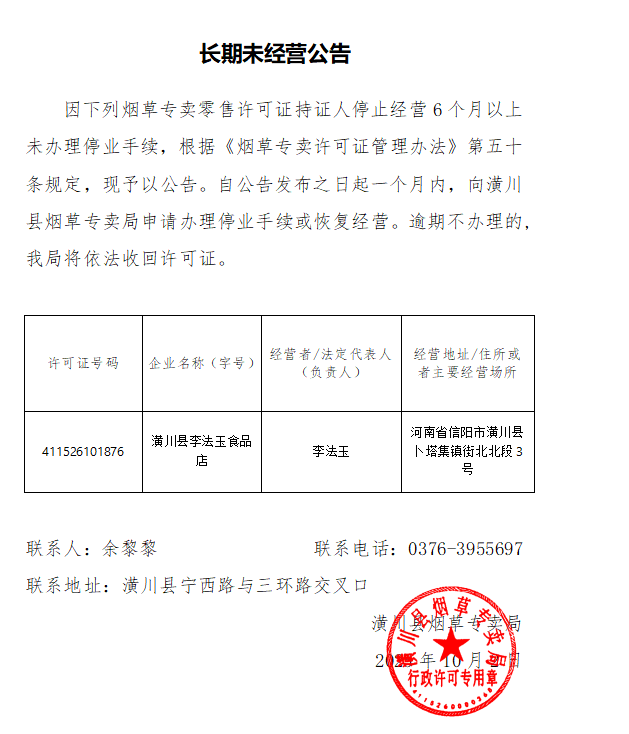 潢川县烟草专卖局长期未经营公告(2025.10.2)