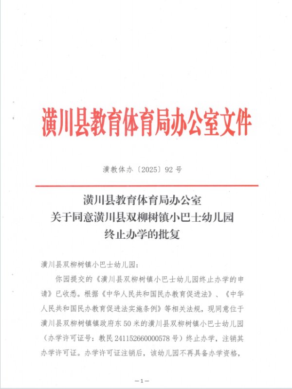 潢川县教育体育局办公室关于同意潢川县双柳树镇小巴士幼儿园终止办学的批复