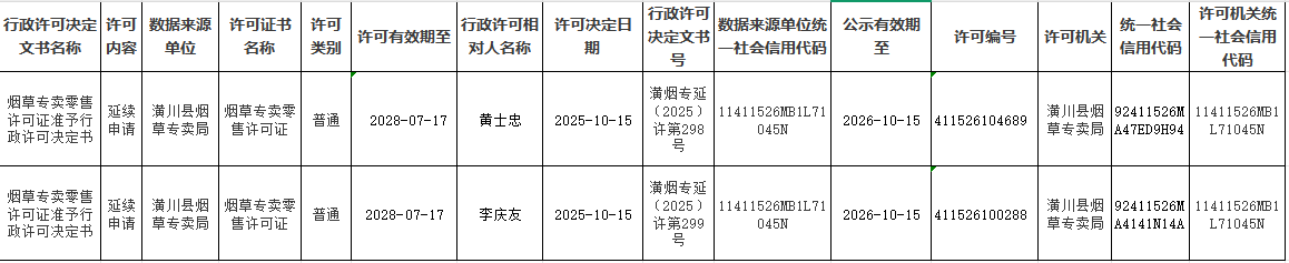 潢烟专延〔2025〕许第298号、潢烟专延〔2025〕许第299号