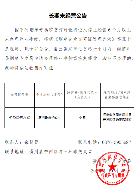 潢川县烟草专卖局长期未经营公告(2025.10.25)