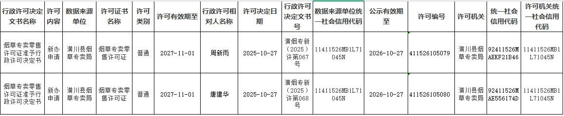潢烟专新〔2025〕许第067号、潢烟专新〔2025〕许第068号