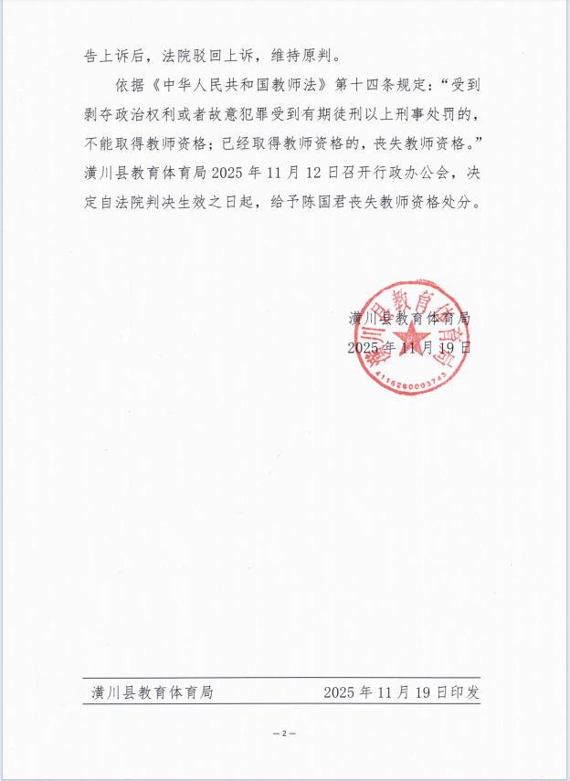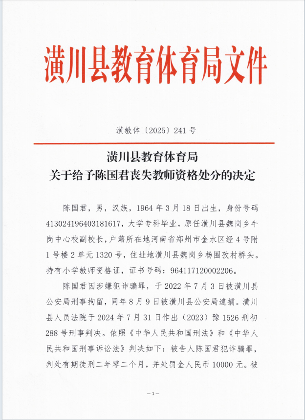 潢川县教育体育局关于给予陈国君丧失教师资格处分的决定