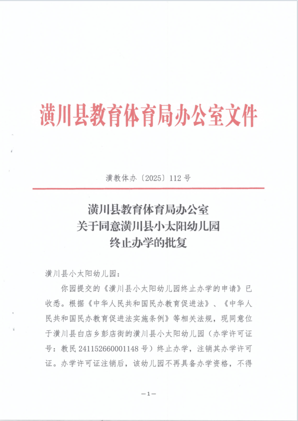 潢川县教育体育局办公室关于同意潢川县小太阳幼儿园终止办学的批复
